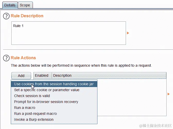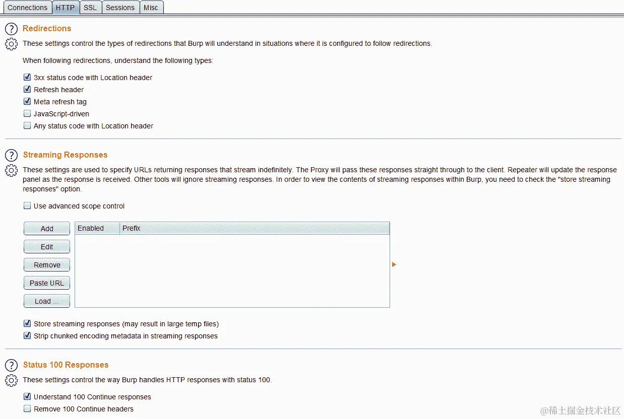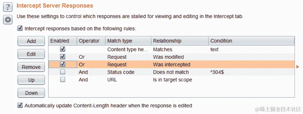- 启用服务器响应拦截:默认情况下,Burp 未配置为拦截服务器响应。但是,可以在代理|选项下的拦截服务器响应选项中启用。启用在请求|被修改时和请求|被拦截时拦截响应。