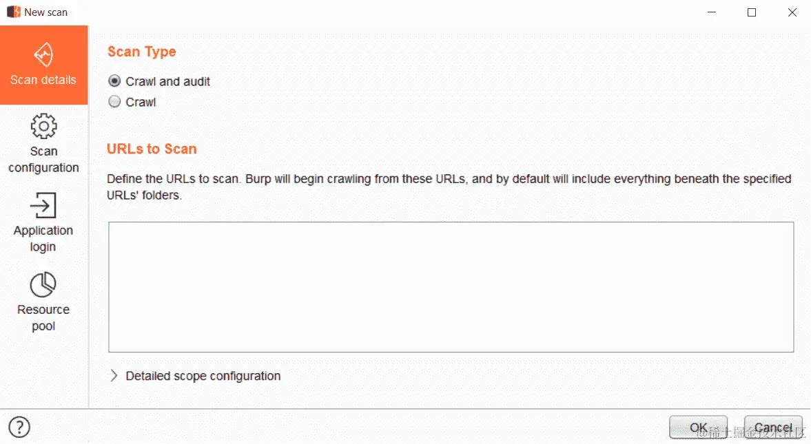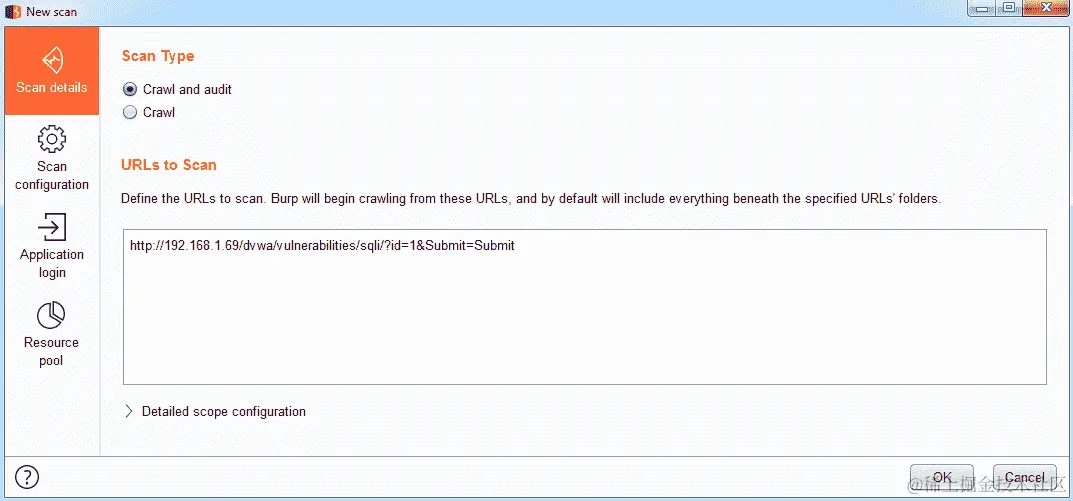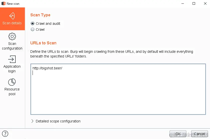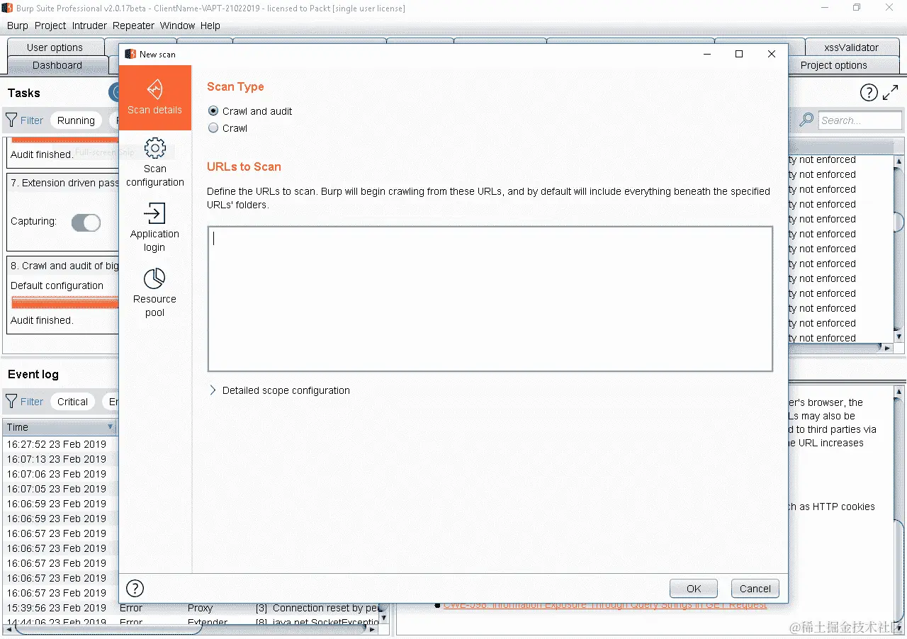 当您使用扫描器 Burp Suite 测试应用程序的漏洞时,您可以修改有关扫描器工作方式的选项,并配置用于自动登录的凭据。这对于大多数应用程序来说非常重要,因为它们大多数都有身份验证控制。为了利用 XXE,我们将对我们拥有的 URL 进行简单的扫描。单击“确定”按钮后,扫描开始。