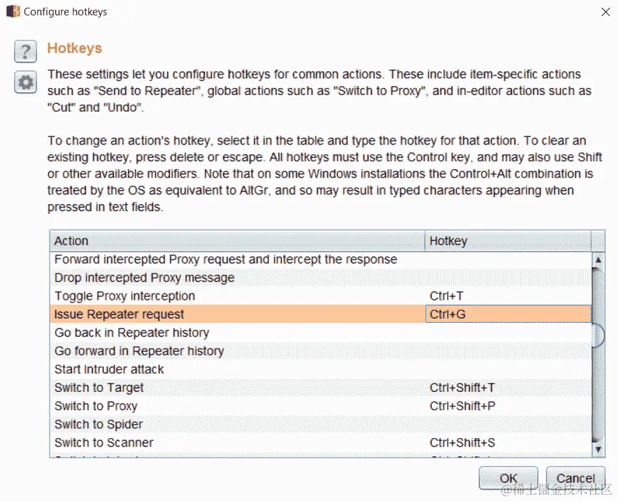 - 设置发出 Repeater 请求的键盘快捷键:这是一个非常有用的设置,可以在使用 Burp 的 Repeater 模块时启用,以避免使用鼠标单击“Go”按钮。Burp 已经允许通过代理|历史记录选项卡使用Ctrl + R将项目发送到 Repeater。使用Ctrl + Shift + R可以切换到 Repeater 窗口。添加一个快捷键以使用 Repeater 发送请求完成了从代理|历史记录中选择项目并将其发送的按键链。