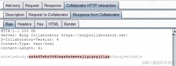 collaborator 使用一个字符串来识别漏洞。如果我们审查 collaborator 的请求和响应,而不是 HTTP 请求,它是不同的。我们可以看到使用的字符串如下: