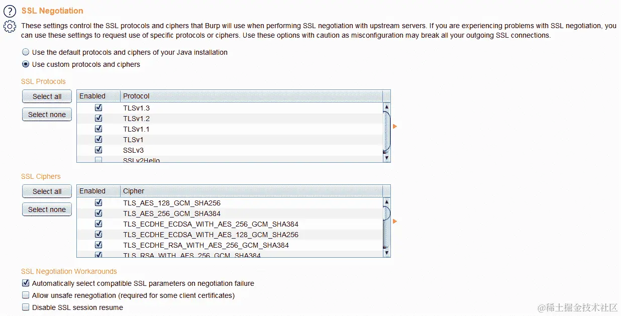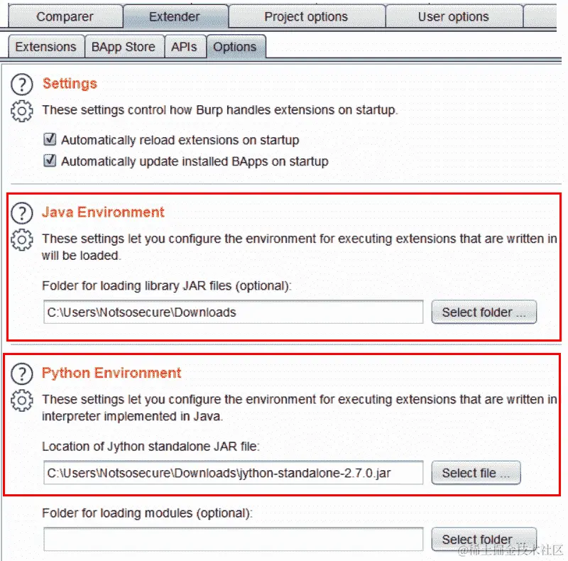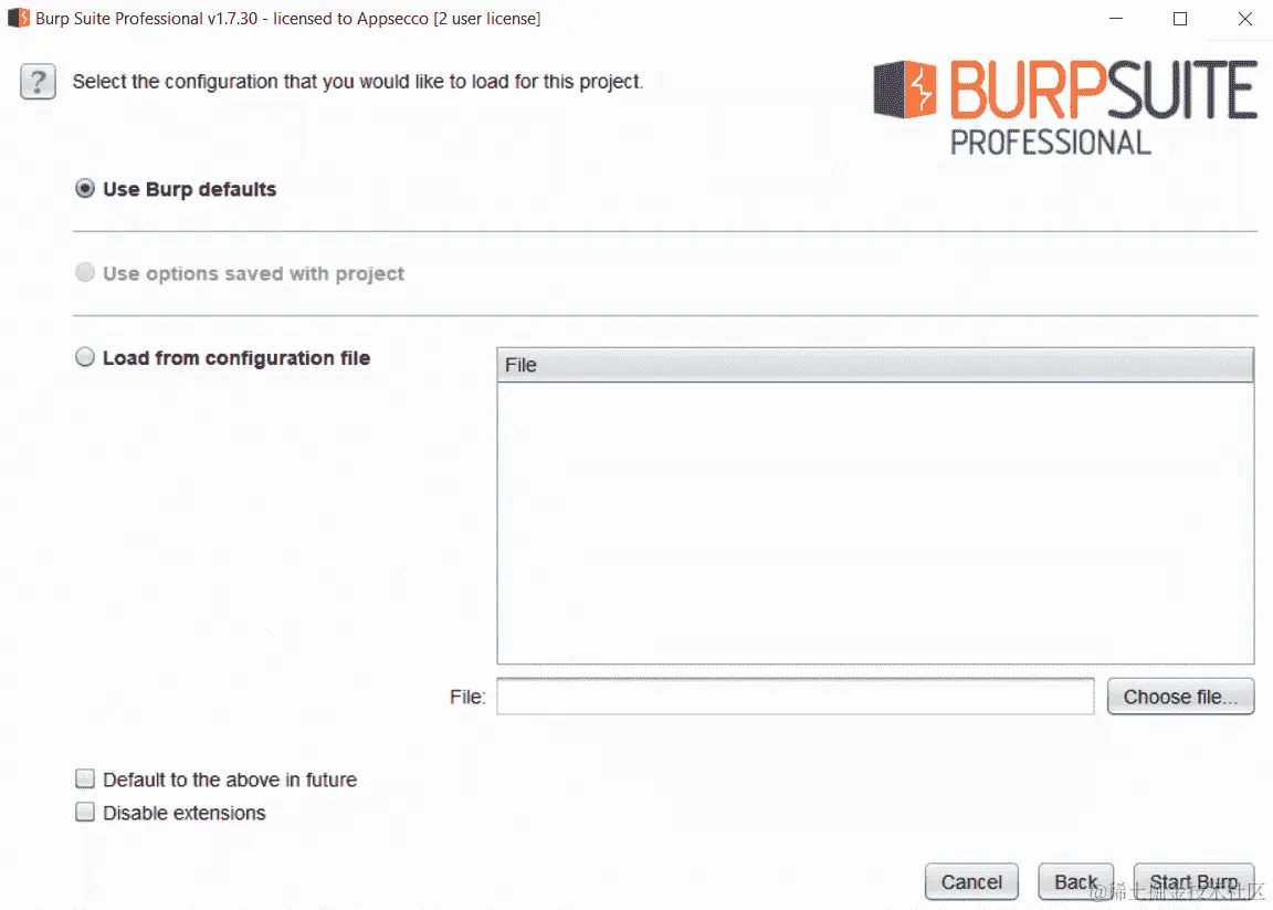 单击“下一步”将带您到一个页面,您可以选择以前的任何保存配置或继续使用 Burp 默认值。当 Burp 启动时,您还可以选择禁用扩展。