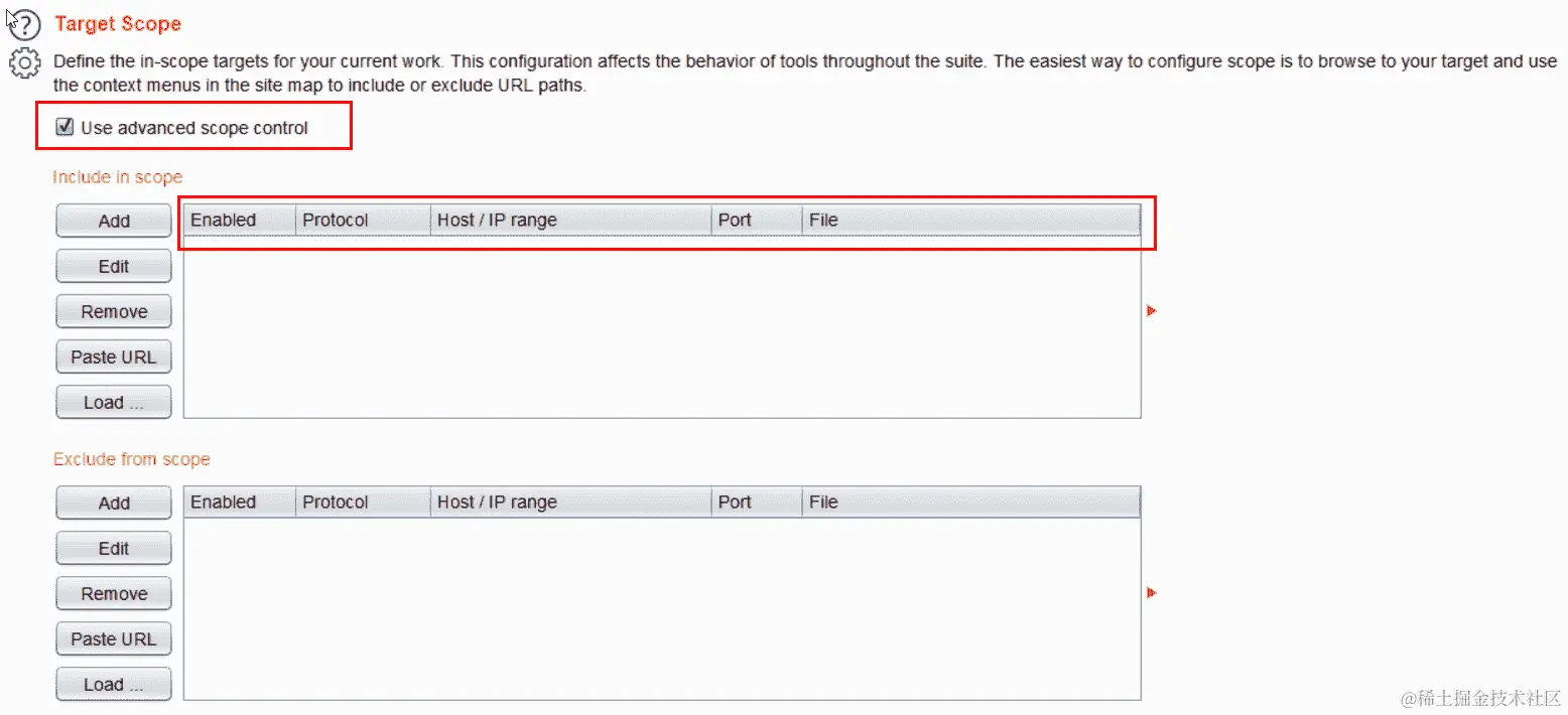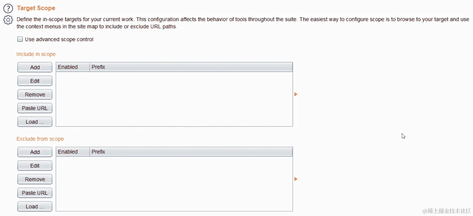 您还可以通过目标|范围页面上的加载按钮加载包含需要在范围内的 URL 列表的文件。此列表必须是由换行符分隔的 URL/目标。大文件可能需要一些时间来加载,Burp 在加载和解析文件后可能会出现冻结的情况,但在文件加载和解析完成后将恢复工作。