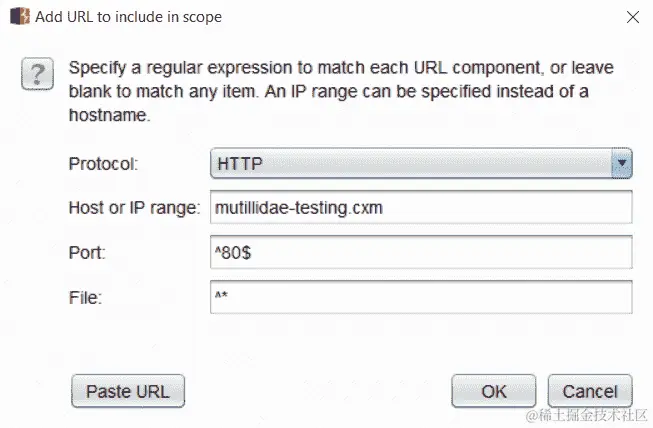 让我们举个例子,为想象中的渗透测试创建我们的范围。假设范围内的应用程序位于http://mutillidae-testing.cxm/。使用目标|范围选项卡,我们可以通过设置以下内容将此应用程序和以后的所有 URL 添加到范围: