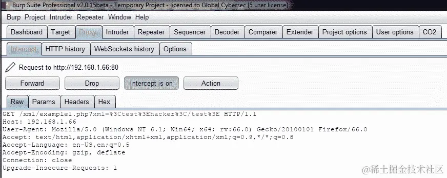 这意味着这是一个接受 XML 作为输入的请求。因此,我们将使用 Burp Suite 的代理修改输入,以查看应用程序是否接受我们的测试字符串。为此,我们将使用以下输入: