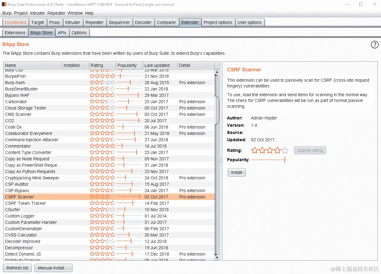 可以从 PortSwigger 网站portswigger.net/burp下载 Burp 适用于所有主要操作系统。对于 Windows 系统,提供了 x64 位和 x32 位的安装程序。还提供了一个独立的 Java JAR 文件,以便您可以将 Burp 作为便携式应用程序运行。