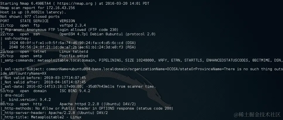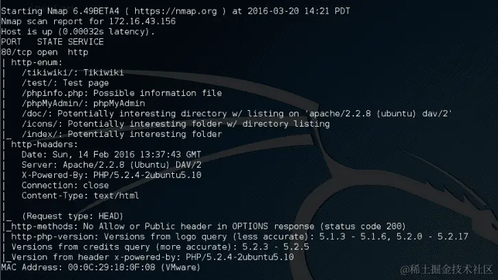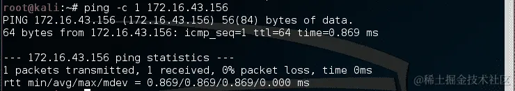 目标服务器位于172.16.43.156,而您的机器的 IP 地址为172.16.43.150。要检查目标服务器的可用性,您可以给出以下命令: