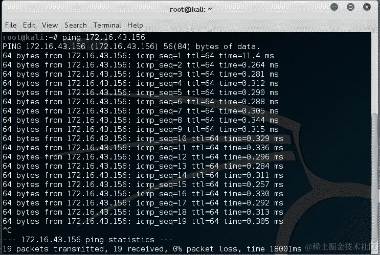 在 Kali Linux 中,默认情况下,ping将持续运行,直到按下Ctrl + C。