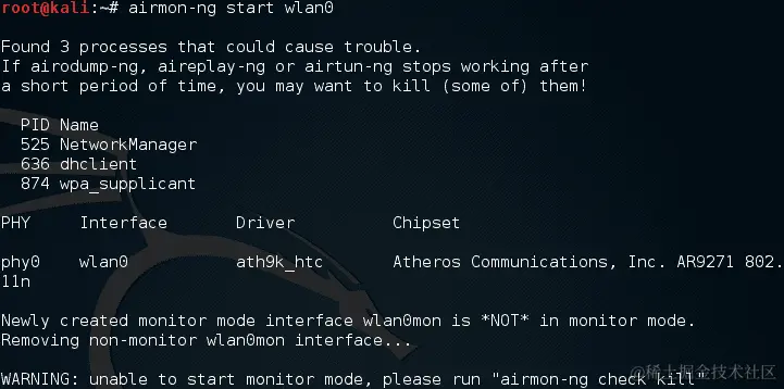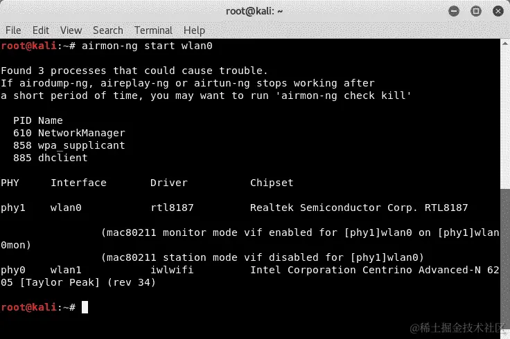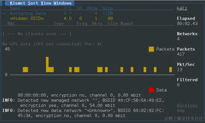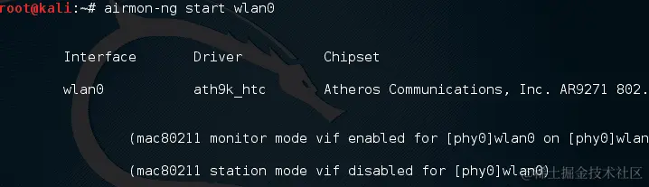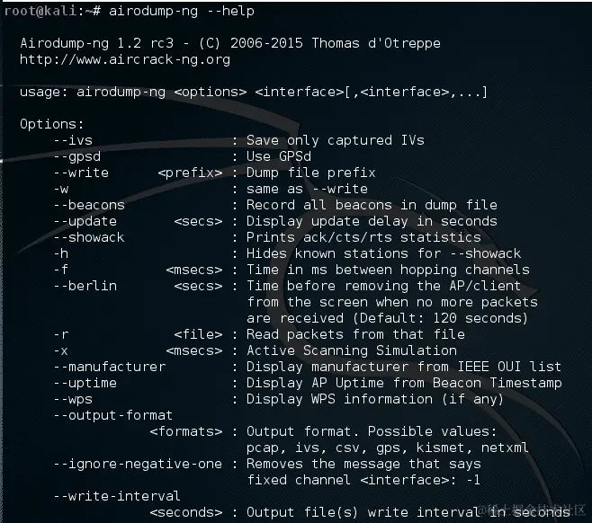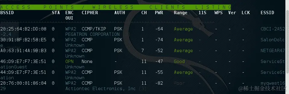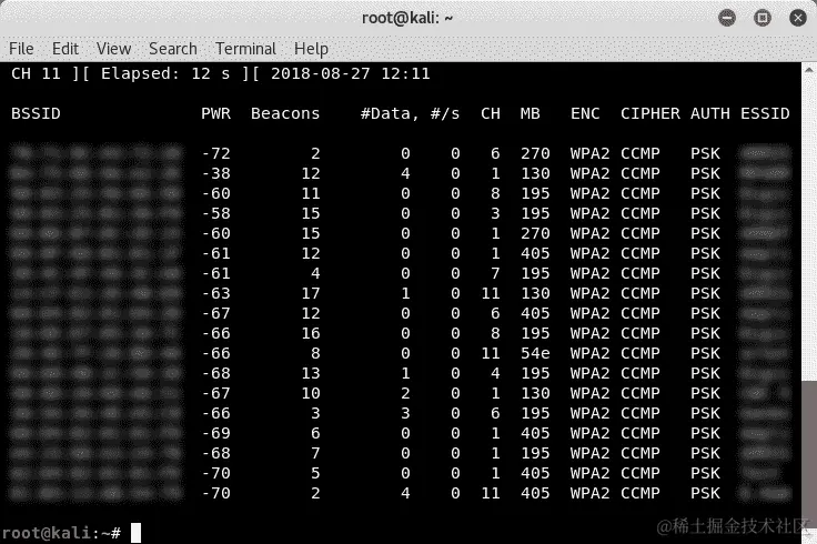 airmon-ng start <interface>来确定目标网络,然后启动airodump-ng <interface>来开始列出当前正在广播的所有网络: