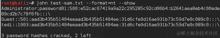 离线攻击:在这种方法中,攻击者从目标机器获取哈希文件并将其复制到攻击者的机器上。然后,攻击者使用密码破解工具来破解密码。使用此方法的优势在于,攻击者无需担心目标机器中可用的密码阻止机制,因为该过程是在本地完成的。