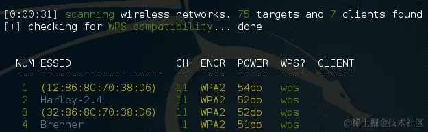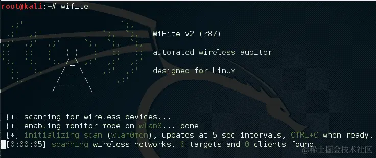 Wifite 将自动将无线卡置于监视模式,然后开始扫描无线网络: