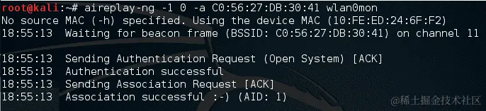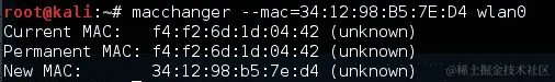 在这个例子中,我们已经确定了一个连接到目标无线网络的无线客户端,其 MAC 地址为34:12:98:B5:7E:D4。要将我们的 MAC 地址更改为模拟合法的 MAC 地址,只需在命令行中输入以下内容: