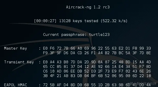 点击 Wifi 攻击按钮。Fern Wifi-Cracker 完成了我们之前在 Aircrack-ng 部分介绍的整个过程。这包括解认证客户端,然后捕获四次握手。最后,Fern Wifi-Cracker 将通过密码文件,并且如果密码文件中有该密码,将出现以下消息:
