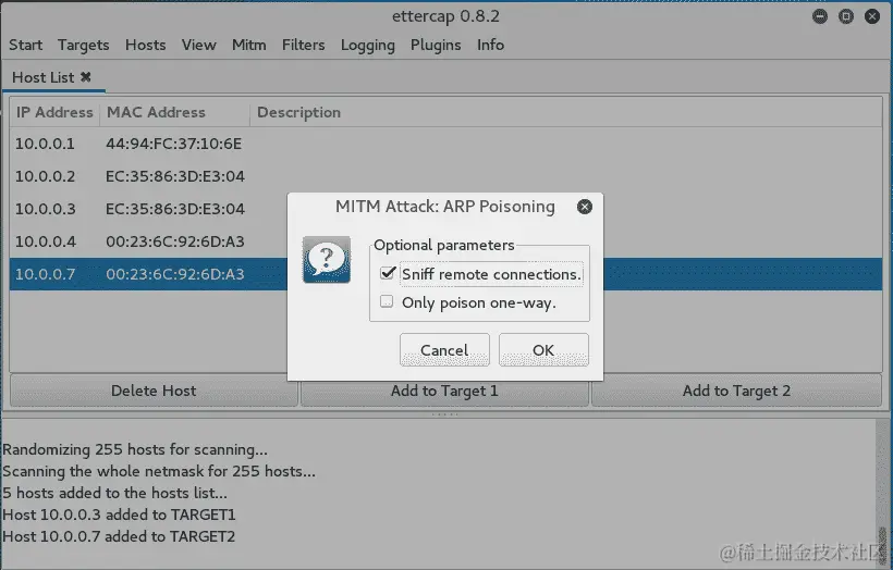 单击 MiTM,然后 ARP 毒化。在下一个屏幕上,选择一个 IP 地址,然后单击目标 1,然后选择第二个 IP 地址,然后单击目标 2: