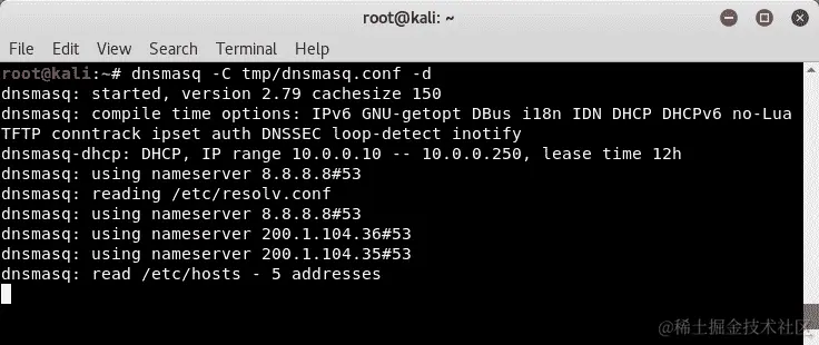 在dnsmasq.conf文件中,我们只指定了接口(at0)、要使用的dhcp范围(10.0.0.10 - 10.0.0.250,12h租约时间)、dhcp-option=3作为网关(10.0.0.1),以及dhcp-option=3作为 DNS 服务器(10.0.0.1)。为什么接口是at0?这是因为airbase-ng创建了一个名为at0的默认桥接口。