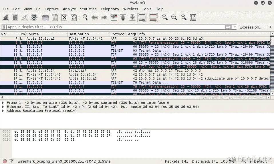 当您检查流量时,我们可以看到捕获的各种类型的流量。最显著的是我们两个主机之间打开的 Telnet 会话: