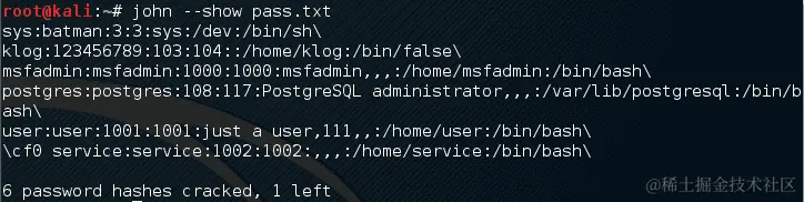 msfadmin:$1$XN10Zj2c$Rt/zzCW3mLtUWA.ihZjA5/:1000:1000:msfadmin,,,:/home/msfadmin:/bin/bash