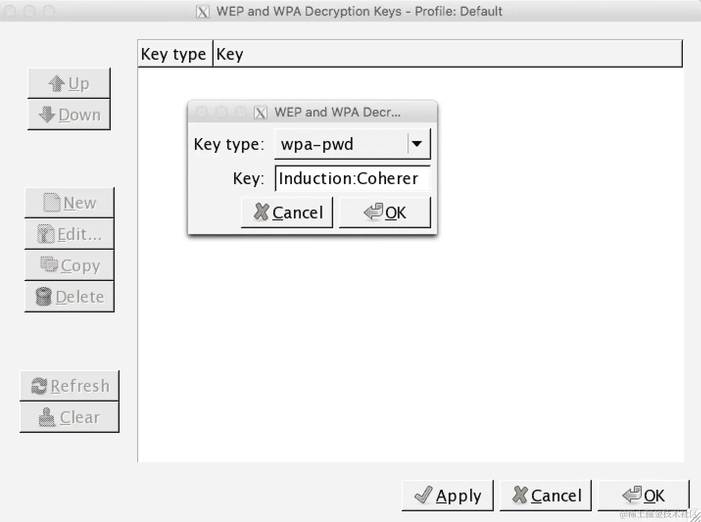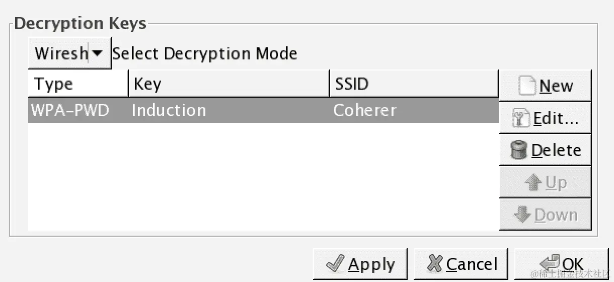 - 在无线工具栏上,单击解密密钥。将会出现一个框。在左上角的下拉菜单中,选择 Wireshark 作为解密模式。确保选择适用的密钥。单击应用和确定: