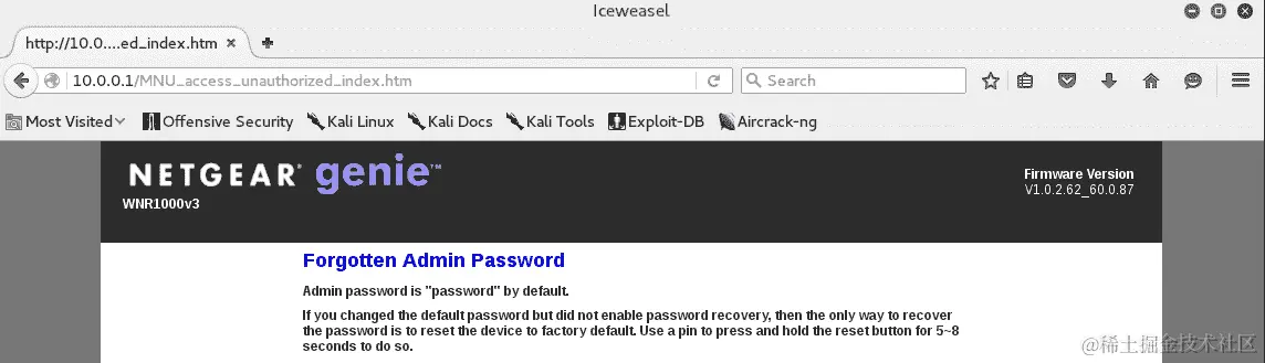 我们看到的是管理员帐户的默认密码。虽然不常见,但并非不可能,这个网络的系统管理员留下了无线路由器的默认凭据。如果我们没有收到这个错误消息,互联网上有大量资源汇总了各种路由器、交换机和无线接入点的默认管理员帐户。