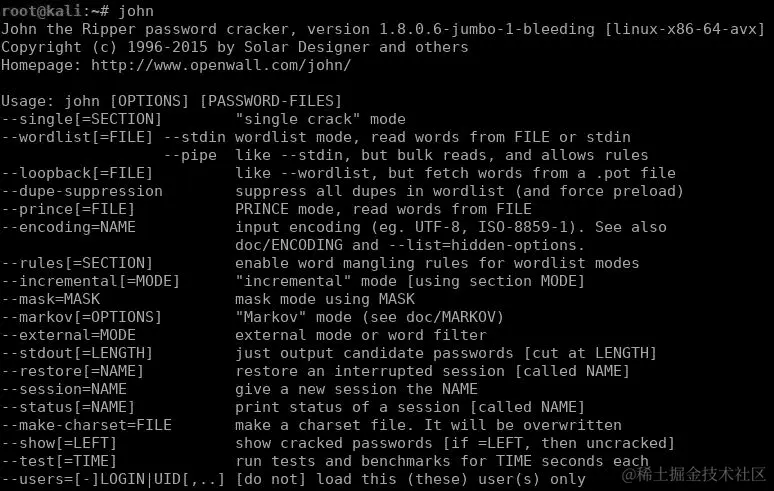 John the Ripper 已经预装在 Kali Linux 中,使用非常简单。您只需键入john即可查看其基本用法: