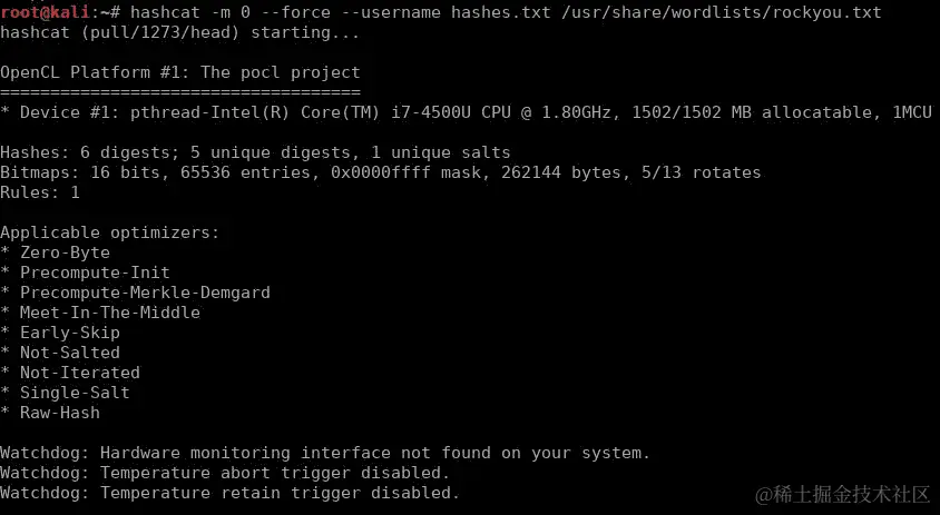 --force:此选项强制 Hashcat 在找不到 GPU 设备时运行,这对于在虚拟机中运行 Hashcat 很有用 -