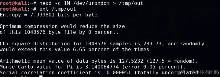 熵增加了,但不像加密样本那样高。这可能是因为样本有限(即只有可打印的 ASCII 字符)。让我们使用 Linux 内置的随机数生成器进行最后的测试: