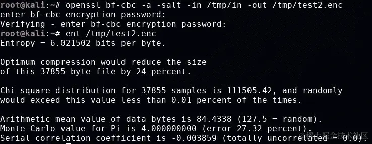 接下来,让我们加密相同的信息并计算熵。在这个例子中,我们将使用 CBC 模式的 Blowfish: