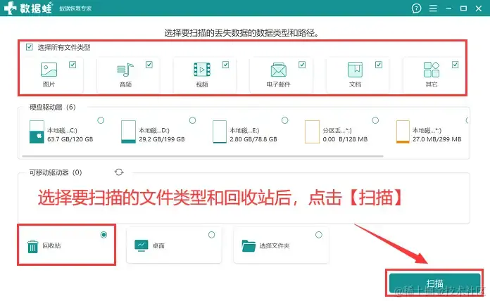 步骤1:先将软件安装到电脑相应的磁盘上,运行它可以进入主界面,在主界面把要扫描的文件类型勾选上,并且勾选 【回收站】 ,点击【扫描】;