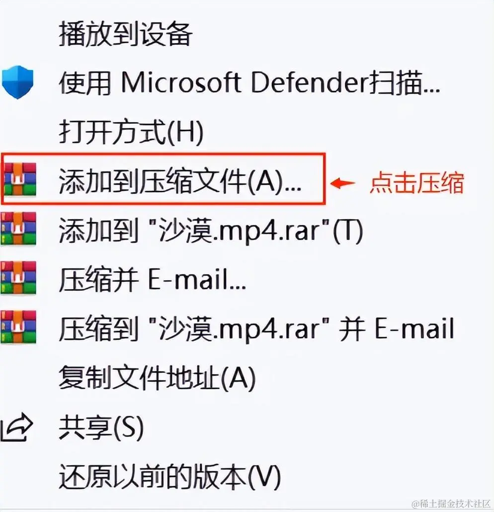 步骤1:在电脑上找到需要压缩的视频文件,右击鼠标,在弹出的菜单中选择 【添加到压缩文件】 选项。