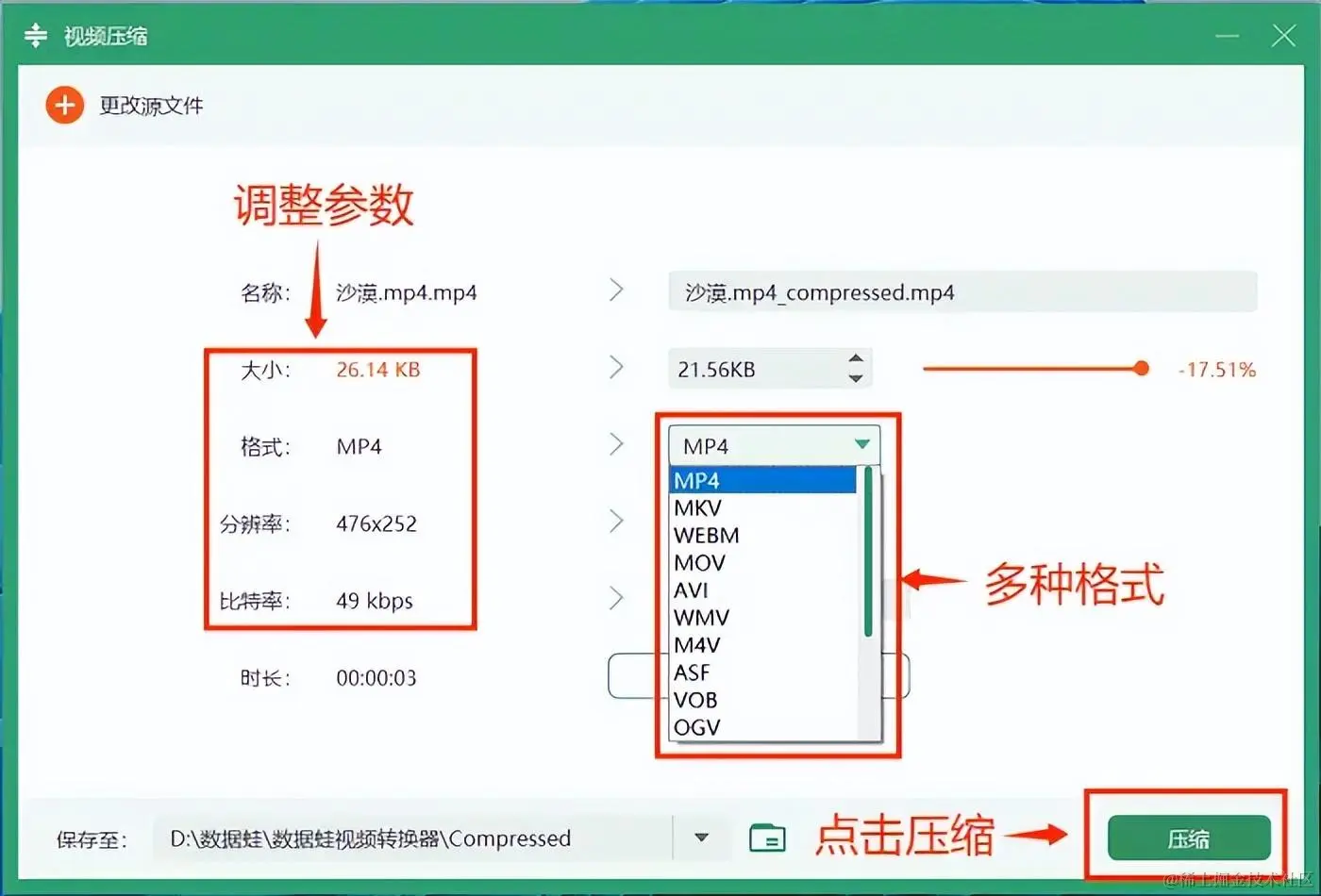 3:通过修改文件格式来压缩视频大小虽然快捷,但某些格式可能会以牺牲视频质量甚至导致文件损坏的方式以完成视频压缩。