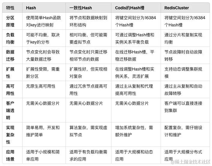 下面是对Hash、一致性Hash、Codis的Hash槽和RedisCluster这四种Redis数据分区方案的对比表: