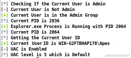 前面的代码检查了目标系统上是否启用了 UAC。如果启用了 UAC,我们进一步深入,使用get_uac_level方法找到 UAC 的级别,并通过其响应值打印状态。