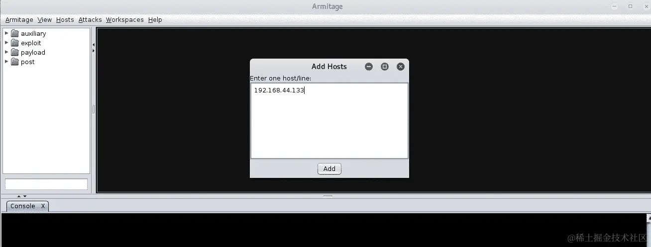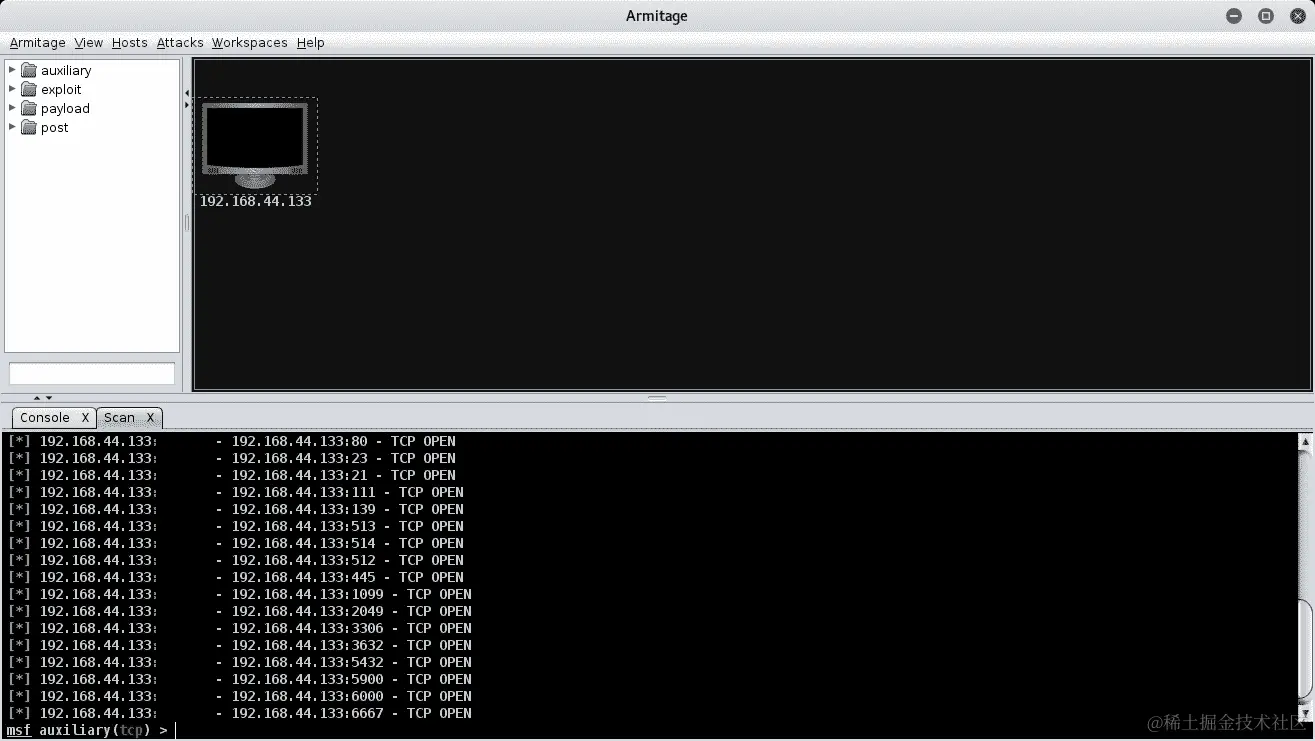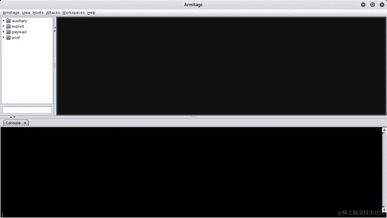 在初始启动时,armitage控制台显示如下屏幕截图所示: