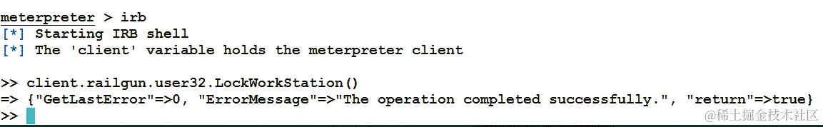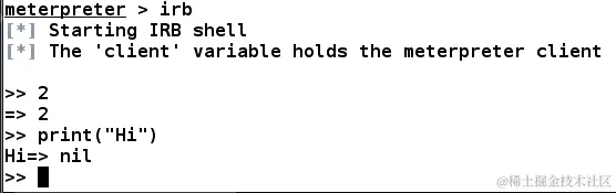RailGun 需要将irb shell 加载到 Meterpreter 中。让我们看看如何从 Meterpreter 跳转到irb shell: