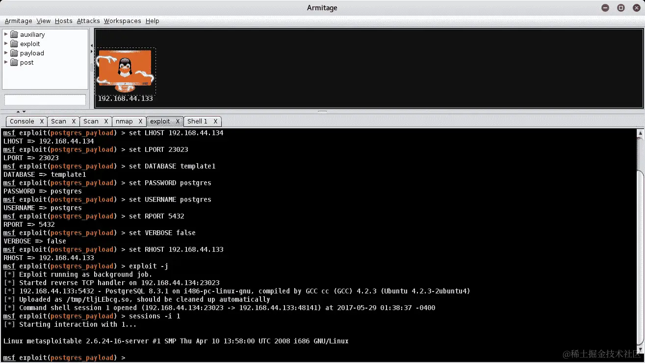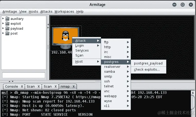 一旦 Armitage 控制台完成查询可能的利用,您可以通过右键单击主机并选择“攻击”菜单来查看适用的利用列表。在这种情况下,我们将尝试利用postgresql漏洞,如下面的屏幕截图所示: