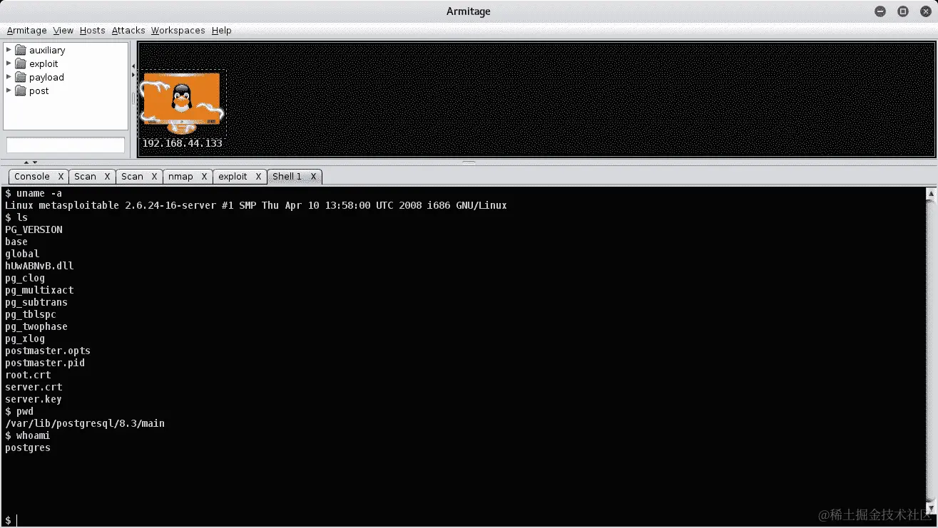 与被攻陷的主机进行交互时,在 Armitage 控制台的底部窗格中打开了一个名为“Shell 1”的新选项卡,如下面的屏幕截图所示。从这里,我们可以远程执行所有 Linux 命令:
