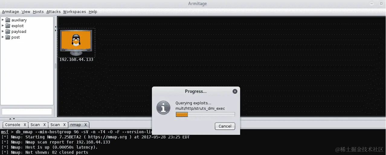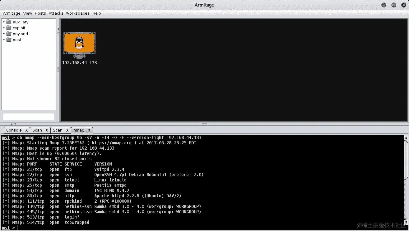请记住,Armitage 在后台使用 Metasploit;因此,为了使用 Armitage,您需要在系统上运行一个正在运行的 Metasploit 实例。Armitage 不仅与 Metasploit 集成,还与其他工具(如 NMAP)集成,用于高级端口扫描和枚举。