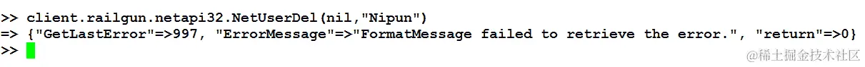 用户似乎已经去钓鱼了。RailGun 调用已成功删除了用户Nipun。nil值定义了用户在本地机器上。但是,我们也可以使用名称参数来针对远程系统。