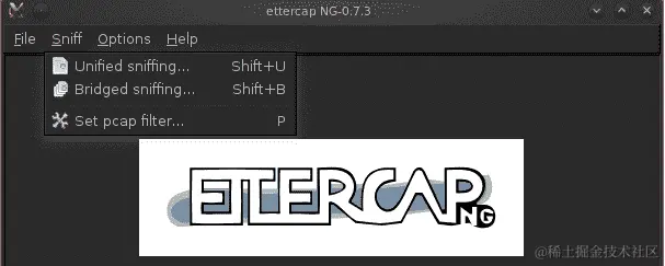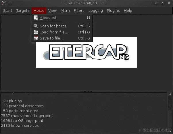 上述命令将以图形模式启动 Ettercap,如下面的屏幕截图所示:
