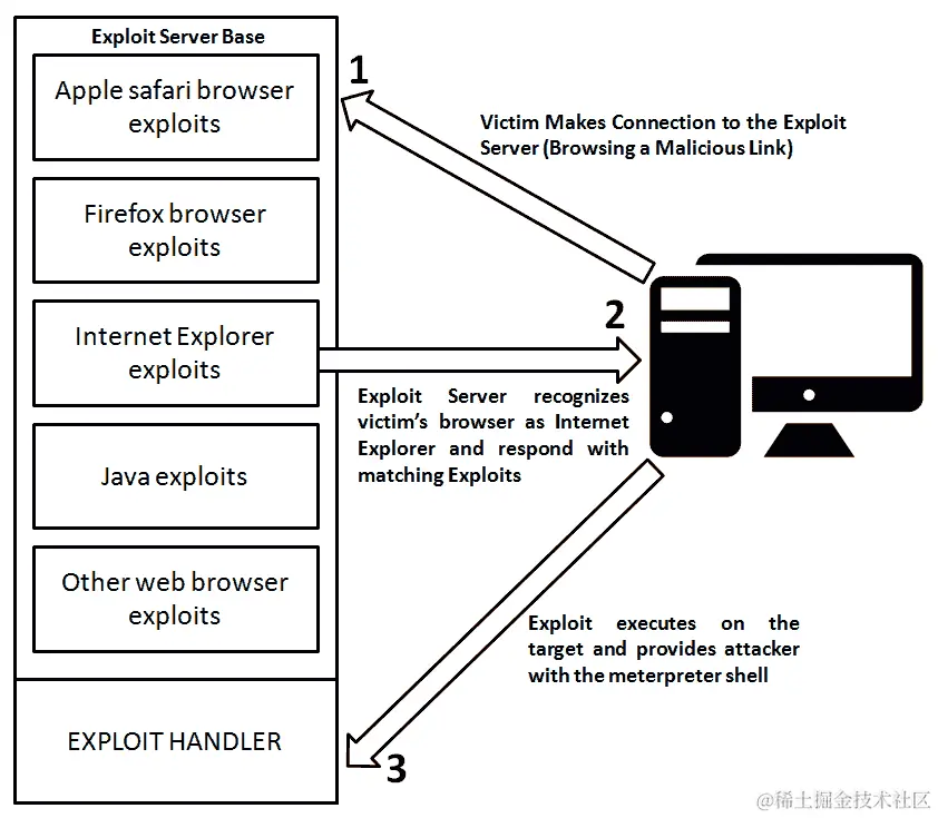 在前面的场景中,一个利用服务器基地正在运行,并配置了一些基于浏览器的利用程序及其匹配的处理程序。一旦受害者的浏览器连接到利用服务器,利用服务器基地会检查浏览器的类型,并将其与匹配的利用程序进行测试。在前面的图表中,我们有 Internet Explorer 作为受害者的浏览器。因此,与 Internet Explorer 匹配的利用程序将被发送到受害者的浏览器。随后的利用程序将与处理程序建立连接,攻击者将获得对目标的 shell 或 meterpreter 访问权限。