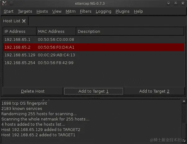 下一步是将路由器地址添加到目标 2,将受害者添加到目标 1。我们将路由器用作目标 2,将受害者用作目标 1,因为我们需要拦截来自受害者并发送到路由器的信息。