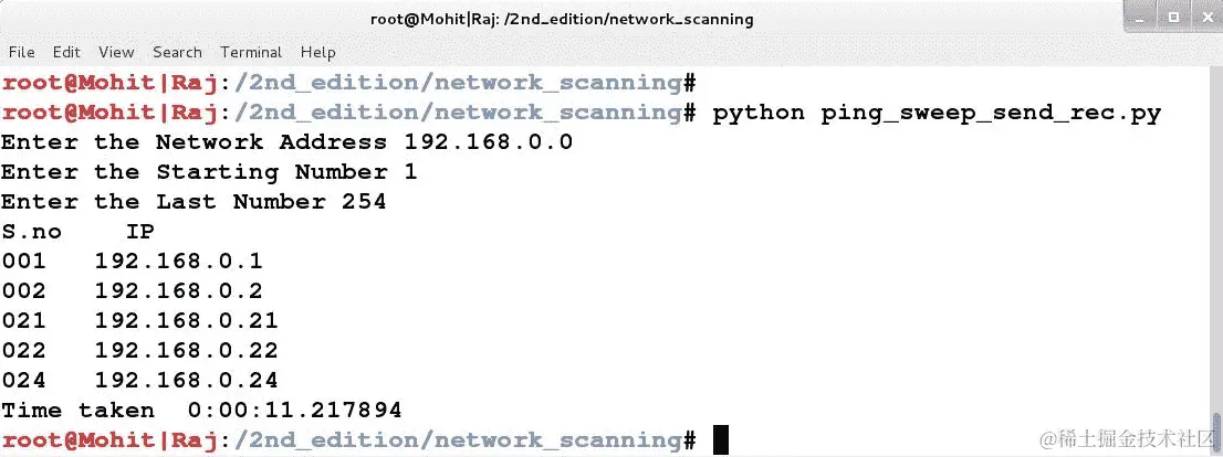 第二章,“扫描渗透测试”,介绍了如何执行网络扫描以收集有关网络、主机和主机上运行的服务的信息。您将看到一个非常快速和高效的 IP 扫描器。