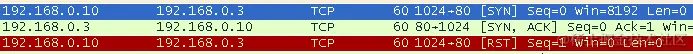 传入的数据包包含RST/ACK标志,这意味着端口是关闭的。现在,我们将目的地更改为192.168.0.3并检查响应: